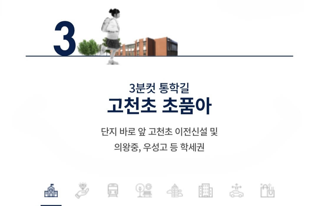 의왕시청역SK뷰아이파크 바로 옆에는 고천초등학교가 신설 이전될 예정입니다. 의왕중학교, 우성고등학교 등이 도보권에 자리하고 있습니다. 또 평촌 학원가와의 거리도 인접했습니다. 단지 인근에는 의왕시청을 비롯해 소방서, 경찰서, 보건소 등 다양한 행정기관들이 자리하고 있습니다.